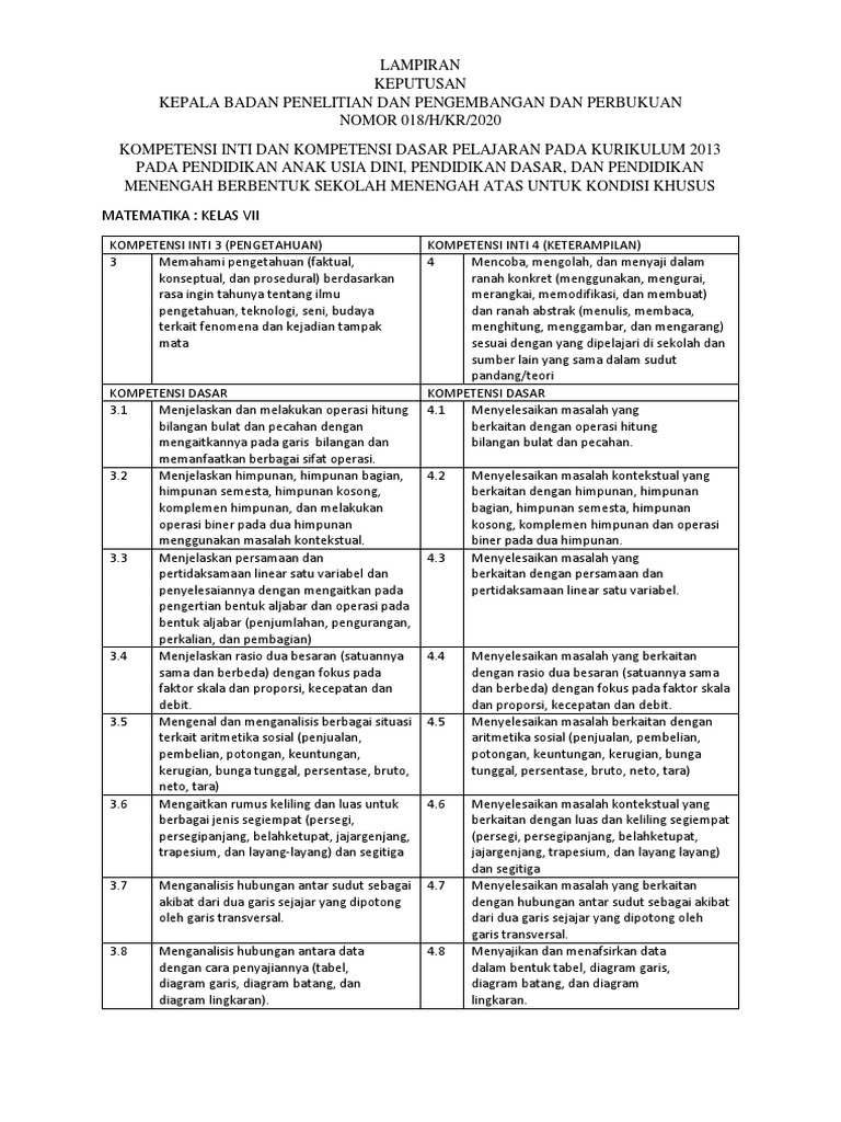 Untuk melaksanakan kebijakan mengenai kurikulum yang sesuai dengan kebutuhan pembelajaran bagi peserta didik dalam kondisi khusus berdasarkan keputusan menteri pendidikan dan kebudayaan nomor 719/p/2020 tentang pedoman pelaksanaan kurikulum pada satuan pendidikan dalam kondisi khusus, perlu ditetapkan keputusan kepala badan penelitian dan pengembangan dan perbukuan tentang kompetensi inti dan. Ki dan kd dalam kondisi khusus tertuang dalam lampiran keputusan kepala badan penelitian dan pengembangan dan perbukuan nomor 018/h/kr/2020 tentang kompetensi inti dan kompetensi dasar pelajaran pada kurikulum 2013 pada pendidikan anak usia dini, pendidikan dasar, dan pendidikan menengah berbentuk sekolah menengah atas untuk kondisi khusus. Di bawah ini adalah download pdf keputusan kepala balitbangbuk kemendikbud nomor: Lampiran keputusan kepala badan penelitian dan pengembangan dan perbukuan nomor 018/h/kr/2020 type : Keputusan kepala badan penelitian dan pengembangan dan perbukuan nomor 018/h/kr/2020 tentang kompetensi inti dan kompetensi dasar pelajaran pada kurikulum 2013 pada pendidikan anak usia dini, pendidikan dasar, dan pendidikan menengah berbentuk sekolah menengah atas untuk kondisi khusus.
