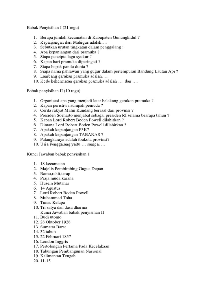 Gerakan pramuka lahir pada tahun 1961, jadi kalau akan menyimak latar belakang lahirnya gerakan pramuka, orang perlu mengkaji keadaan, kejadian dan peristiwa pada sekitar tahun 1960. Peristiwa apakah yang menjiwai majunya gerakan pramuka ( sumpah pemuda ) 44. Bagaimana relevansi sistem among dalam gerakan pramuka dengan pendidikan agama islam? Siapa sahabat dekat bp ( kenneth mc laren) 168. Lambang gerakan pramuka adalah tanda pengenal organisasi gerakan pramuka yang bersifat tetap. (dharma) apa sebutan pramuka di amerika? Tujuan dan manfaat penelitian 1. Kapan peristiwa sumpah pemuda ( 28 oktober 1928 ) 47. Kapan hari pramuka diperingati ? Dikota manakah kh.agus salim mencetuskan nama kepanduan ? Berdasarkan latar belakang di atas, yang menjadi rumusan masalah dalam penelitian ini yaitu : Apa kepanjangan nipv ( nederland indische padvinders vereniging ) 23. Organisasi apa yang menjadi latar belakang gerakan pramuka ( boedi oetomo ) 25.