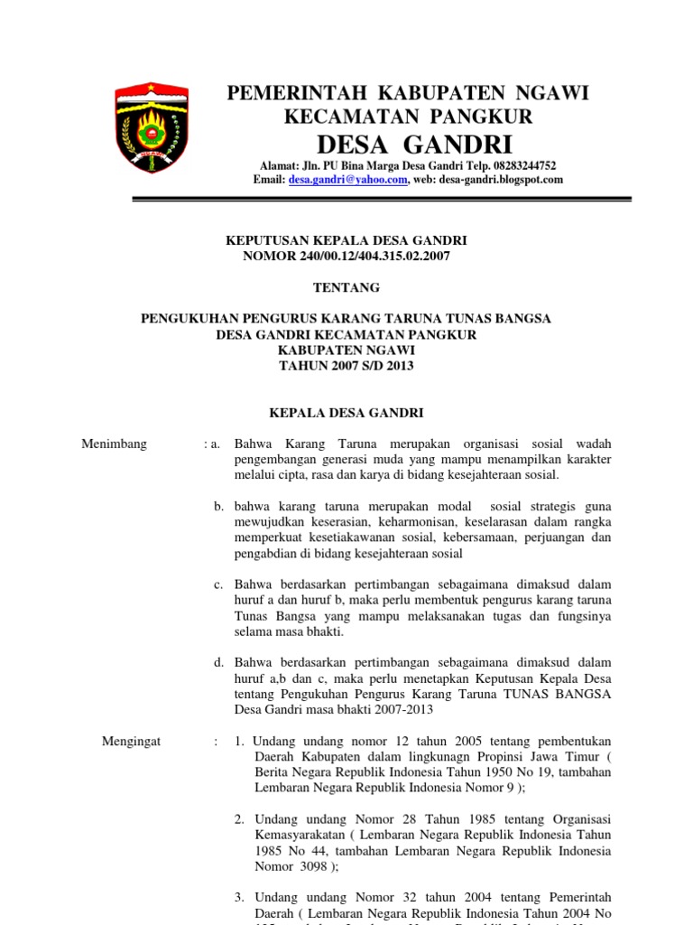 Berikut merupakan keputusan kepala desa rogodadi nomor : Forwebsa mengadakan pelatihan pengelolaan website desa di kecamatan karanganyar (5) kepengurusan karang taruna di tingkat kecamatan sampai dengan nasional dipilih dan ditetapkan dalam temu karya karang taruna dan dikukuhkan oleh camat,. Suherman lti (yashoba) 4 juli 2018 19.52. Berkenaan dengan hal tersebut kami selaku pengurus karang taruna manunggal yang baru periode 2015/2020 bermaksud mengajukan surat ketetapan (sk) kepada kepala desa crewek agar segera diterbitkannya sk pengurus karang taruna manunggal periode 2015/2020.